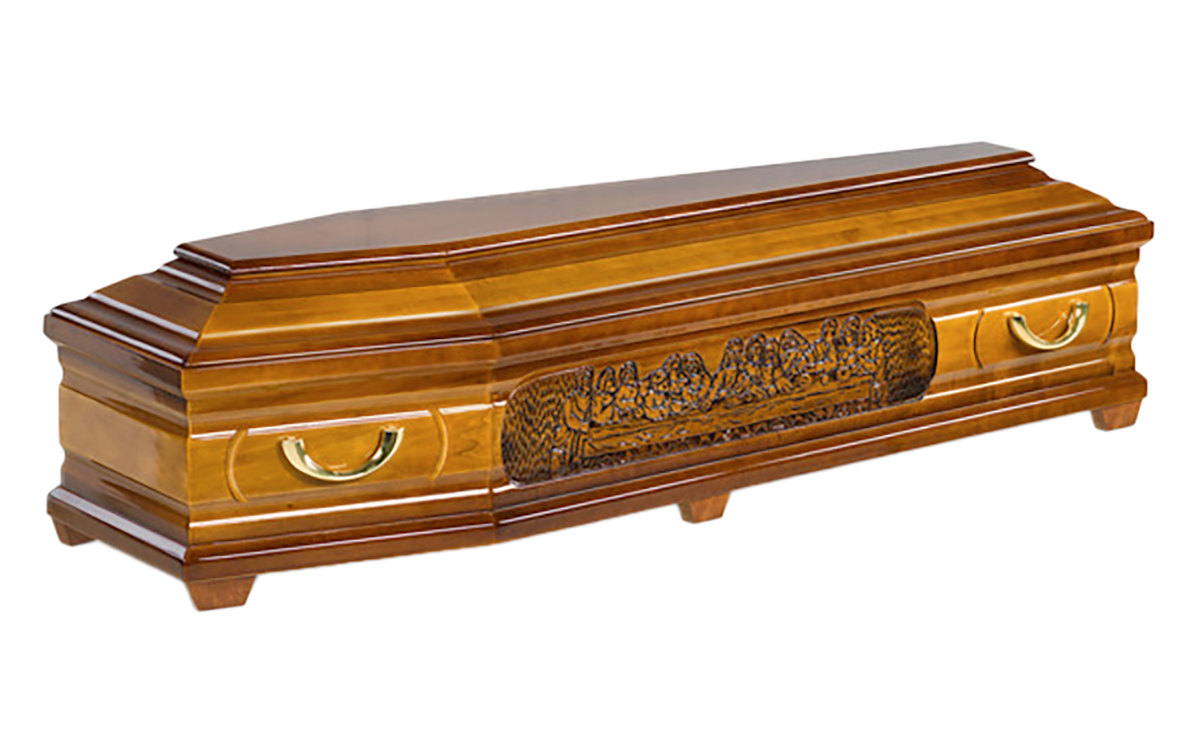 Kista i poppel med ett utfräst motiv av Jesus sista måltid. Denna detaljerade kista är vackert arbetad och prydd med eleganta guldfärgade metallhandtag. Invändigt är kistan klädd med madrass, kudde och ett klassiskt noppat täcke med överlakansflik i bomull. Locket är oklätt och ger kistan ett stilrent intryck. Genom vårt samarbete med Growing Trees Network bidrar vi till klimatkompensation genom att plantera träd.